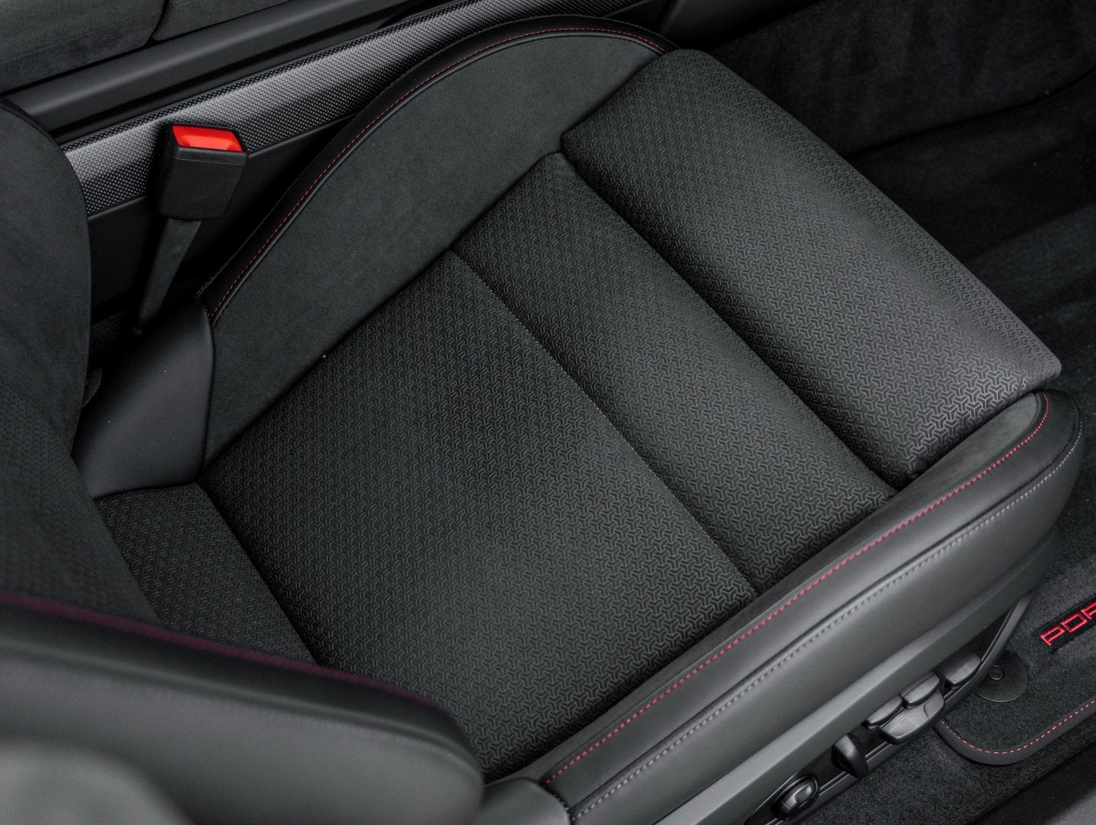 Step inside and experience an environment that balances motorsport DNA with luxury. The GTS Interior Package in Carmine Red is accented by Matte Carbon Fiber Interior Trim, Illuminated Matte Carbon Fiber Door-Sill Guards, and Seat Belts in Deviated Color. A GT Sport Steering Wheel in Race-Tex with Mode Switches places full control at your fingertips, while the Passenger Display and Advanced 4-Zone Climate Control enhance comfort for every occupant. Details such as Sof Close Doors and Under Door Puddle Light Projectors further highlight the Taycans exclusivity.