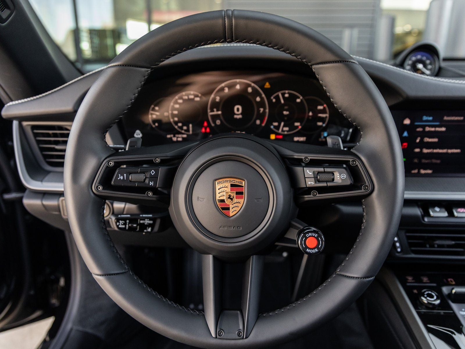 Inside, the Leather Interior in Black with Chalk Stitching offers a sophisticated, driver-focused environment. Adaptive Sport Seats Plus (18-way) with Memory Package, a Heated GT Sport Steering Wheel in Leather, and the 930 Leather Package surround occupants in craftsmanship and comfort. Finishing touches including the Porsche Crest on Headrests, Center Console Lid with Porsche Crest, and Upper Interior Mirror Panel in Leather highlight Porsches meticulous attention to detail.
