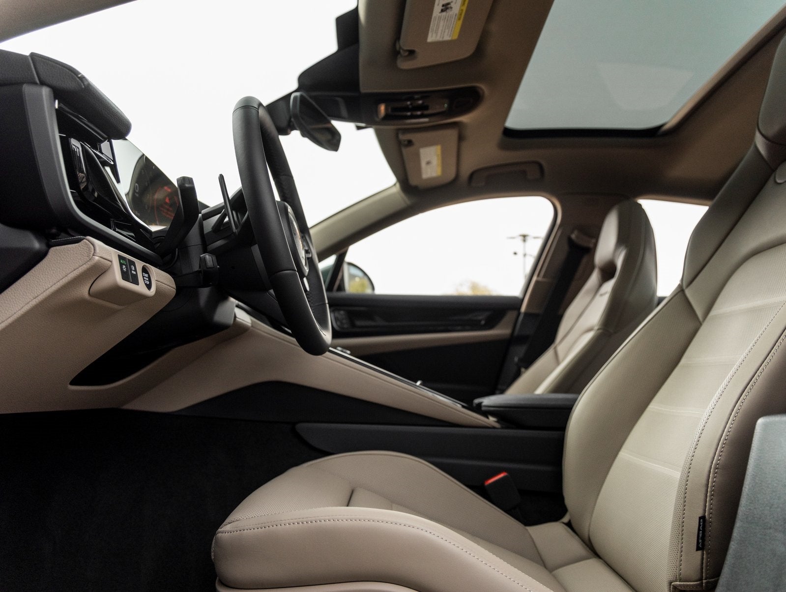 The 2026 Panamera commands attention with its elegant silhouette and optional 21 911 Turbo Design Wheels, which offer a dynamic contrast against the deep green hue of its exterior. The High Gloss Black Window Trim and Exclusive Design Taillights add a sophisticated touch, while HD-Matrix Design LED Headlights ensure brilliance at every angle.