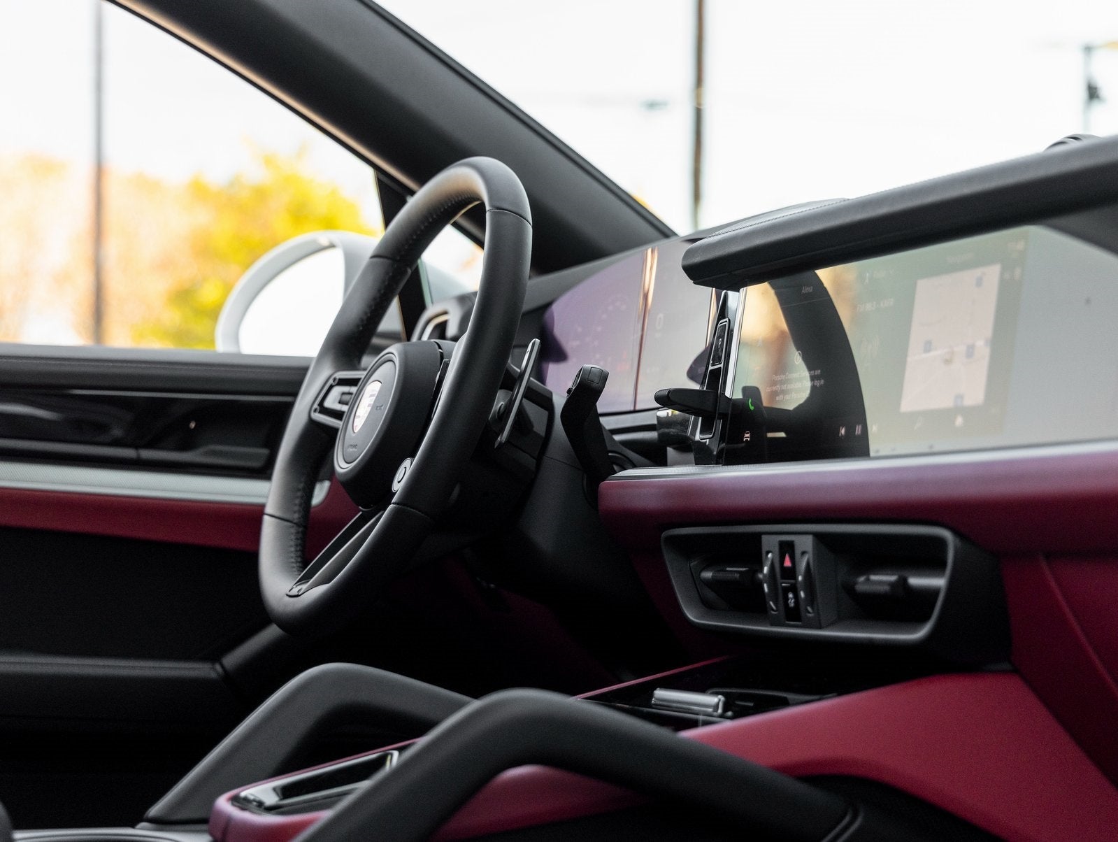 Inside, a Leather Interior in Black/Bordeaux Red creates a sporty and elegant atmosphere. The 18-way Adaptive Sport Seats Plus with Comfort Memory offer tailored comfort, while Ventilated Front Seats and Heated Rear Seats enhance year-round driving enjoyment. Details like the Porsche Crest on Headrests, Heated GT Sport Steering Wheel, and 4-Zone Climate Control elevate the cabins experience.