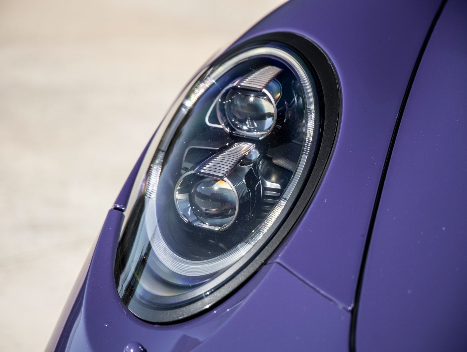 The GT3 RS stands as a beacon of design and performance, its Ultraviolet exterior not just a color, but a badge of honor that reflects Porsche's illustrious racing heritage. Adorned with 20/21-inch wheels painted in Silver, LED Headlights in Black with Porsche Dynamic Light System Plus (PDLS+), and SportDesign exterior mirror lower trims painted in high-gloss Black, it presents an intimidating stance. The Headlight Cleaning System Covers in exterior color and Fuel Cap with Aluminum Look Finish enhance the cars motorsport-inspired identity.
