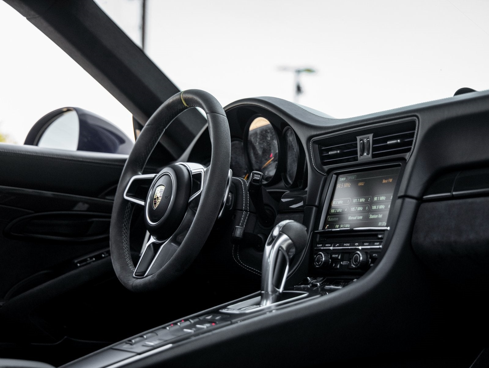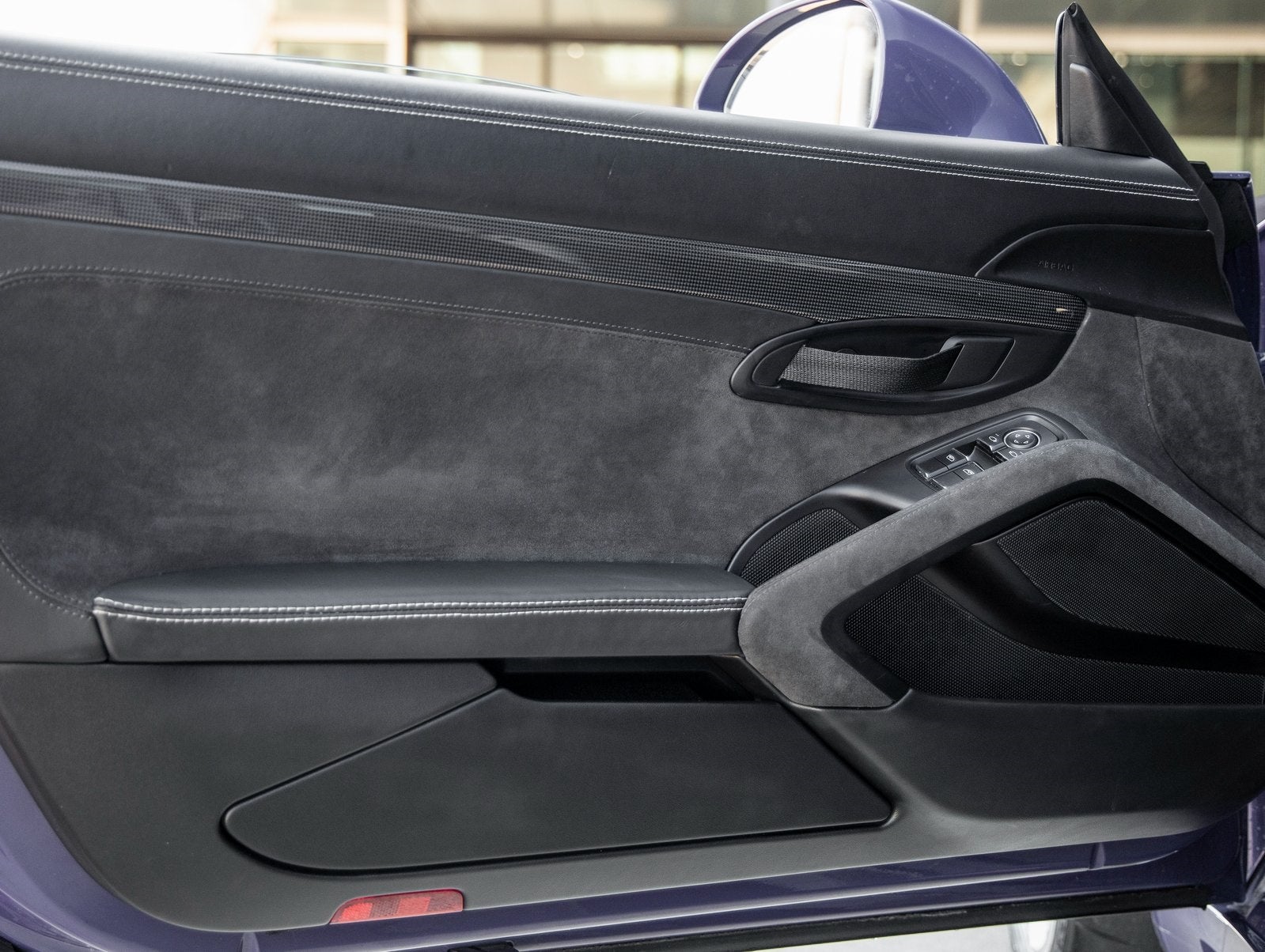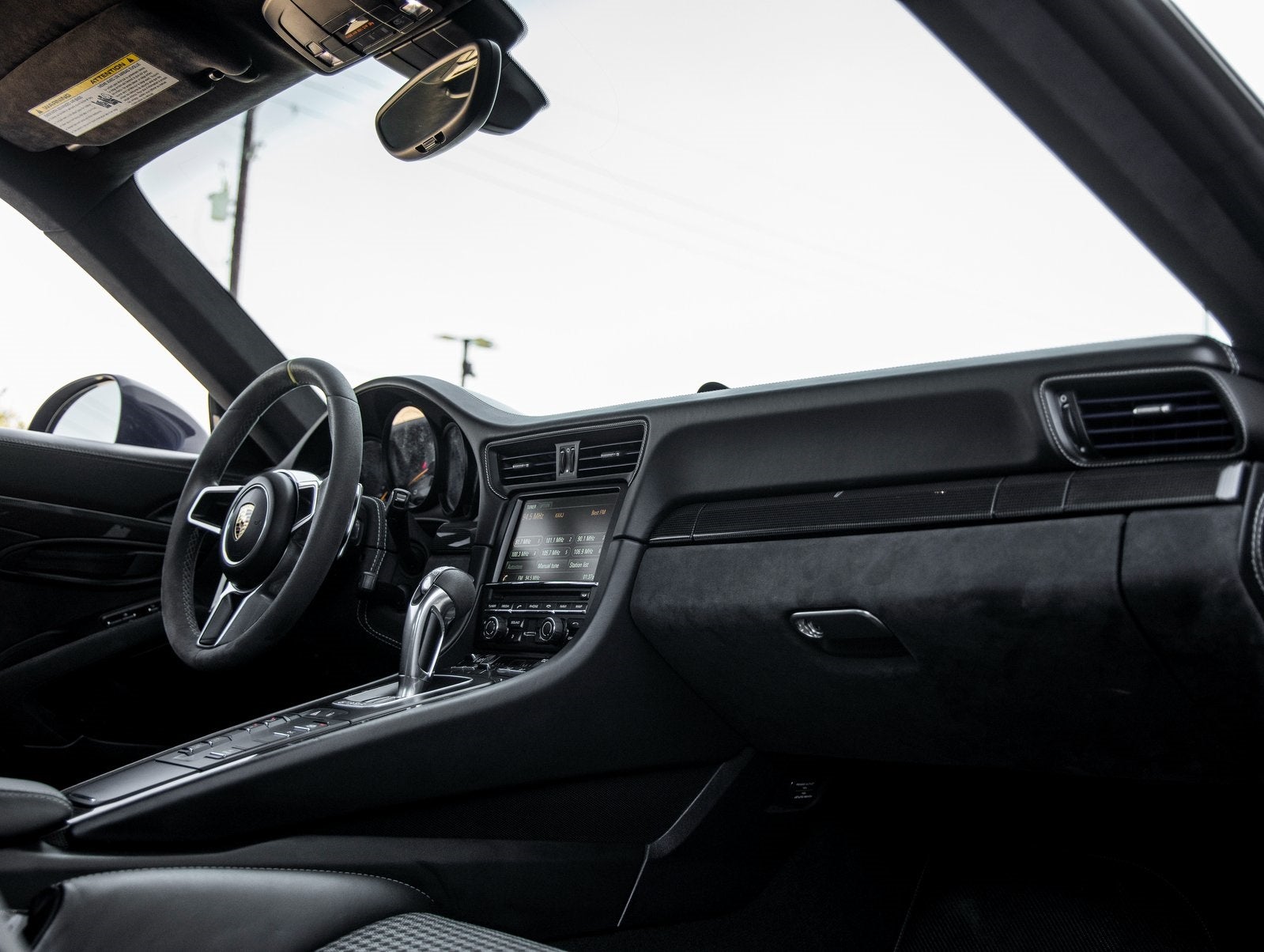 Step inside and the Black / GT Silver Leather and Microfiber interior greets you, exuding an air of luxury that only Porsche can deliver. The Alcantara Sun Visors, Alcantara Belt Outlet Trim, Carbon Fiber Floor Mats with Leather Edging, and Door Panels in Leather/Alcantara showcase a cabin where performance and elegance converge. The vehicle key is also painted to match, and Air Vent Slats are finished for added refinement.