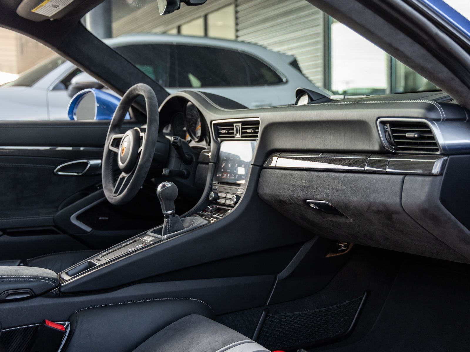 The 911 GT3 stands as a beacon of design and performance, its Sapphire Blue Metallic exterior not just a color, but a badge of honor that reflects Porsche's motorsport dominance. Adorned with LED Headlights in Black with Porsche Dynamic Light System (PDLS) and wheels painted in Satin Black, it presents an aggressive and track-focused stance. The Front Axle Lift System enhances everyday usability, while details like High Gloss Black door handles and deviated headlight cleaning system covers further sharpen its visual appeal.