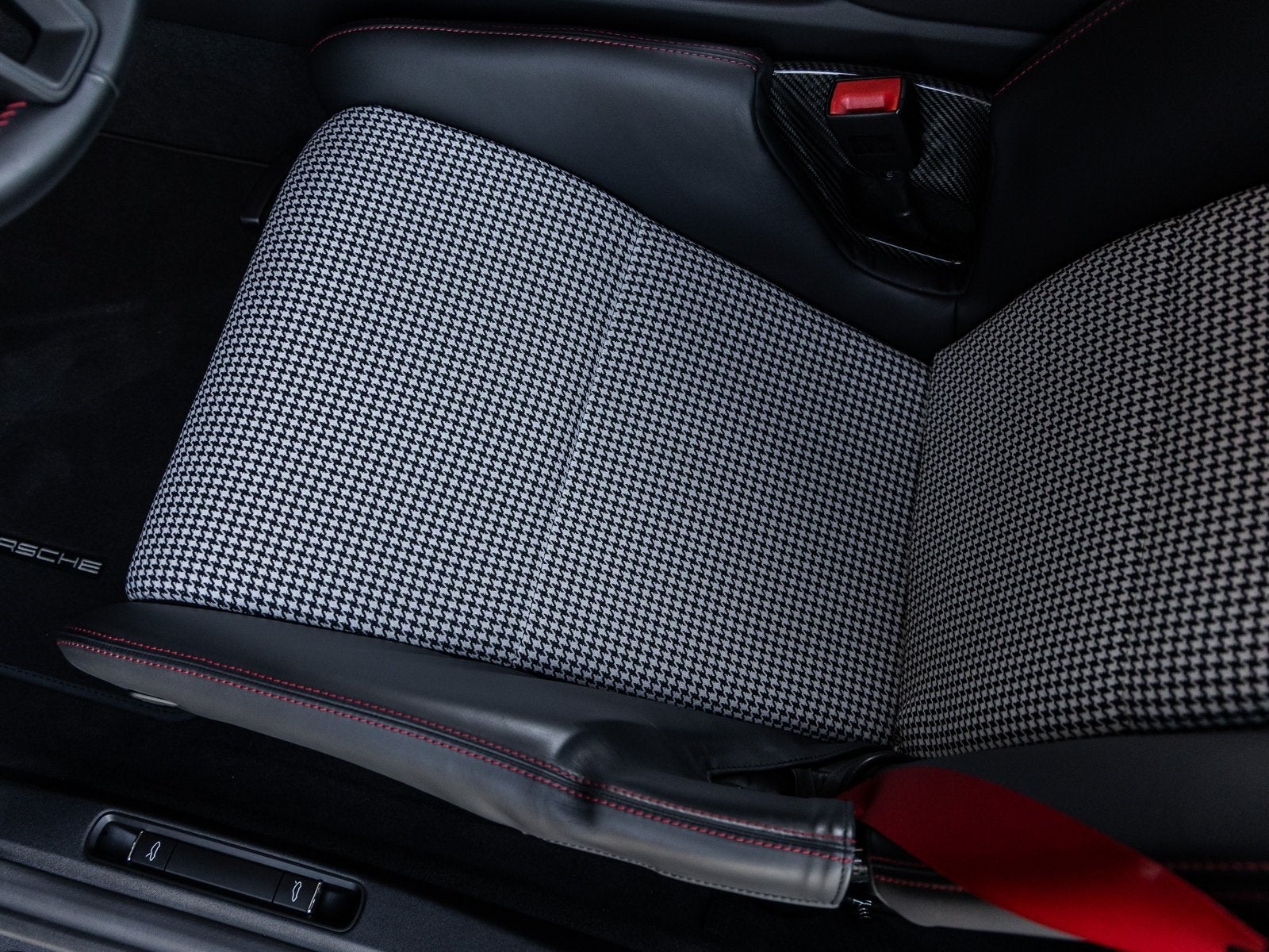 Step inside and the Black Leather Interior with Cloth Seat Centers and Red Stitching welcomes you into a space tailored for focused driving. Full Bucket Seats provide race-inspired support, while Seat Belts in Guards Red and Red Interior Stitching offer striking visual contrast. The BOSE Surround Sound System ensures every drive is accompanied by a concert-quality audio experience, and the Chrono Package with Preparation for Lap Trigger highlights its motorsport DNA.