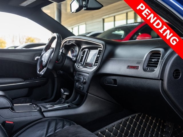 The Charger SRT Hellcat Widebody commands attention with its aggressive stance and unmistakable presence. The Indigo Blue exterior is complemented by the factory Widebody Competition Suspension, 20-inch x 11.0-inch Carbon Black Aluminum Wheels, and SRT Performance Spoiler, giving this sedan both track-ready capability and street-dominating style. Bi-Function HID Projector Headlamps, LED Daytime Running Lamps, and SRT Hellcat Exterior Badges further emphasize its high-performance pedigree, while the Gloss Black Painted Roof adds a menacing finishing touch.