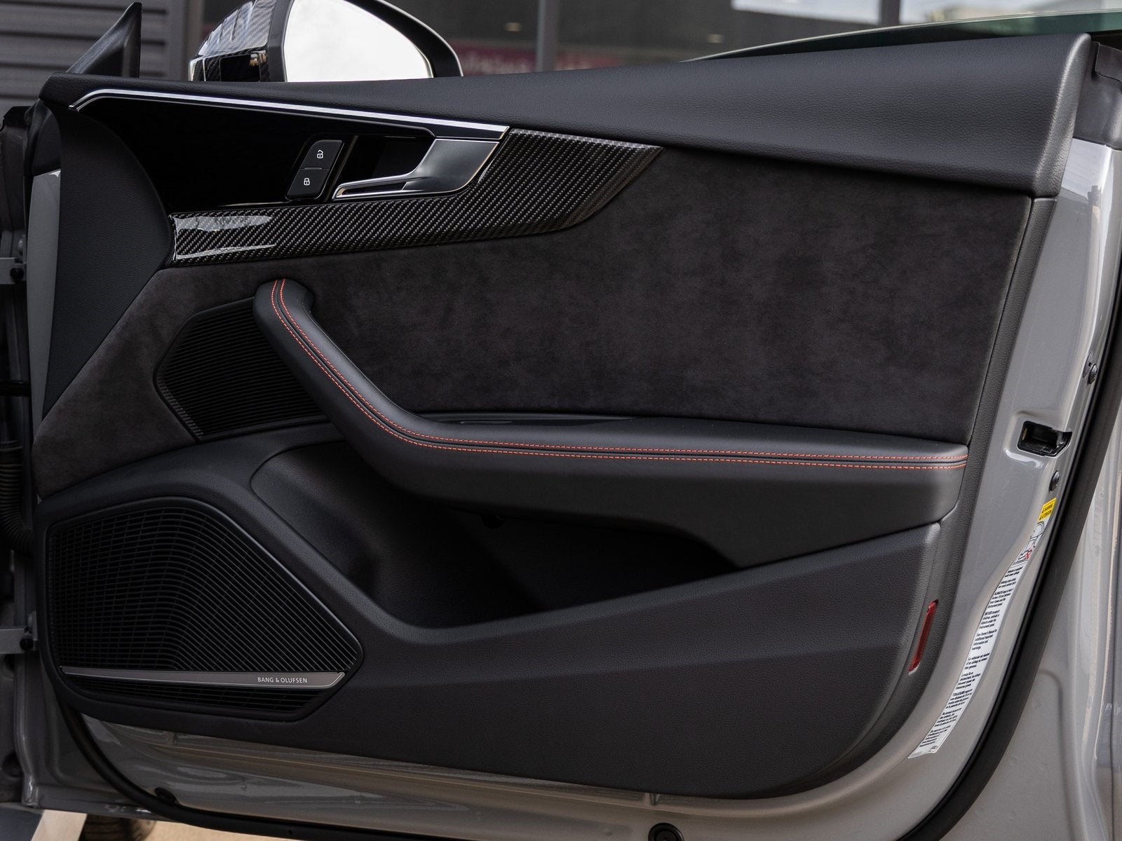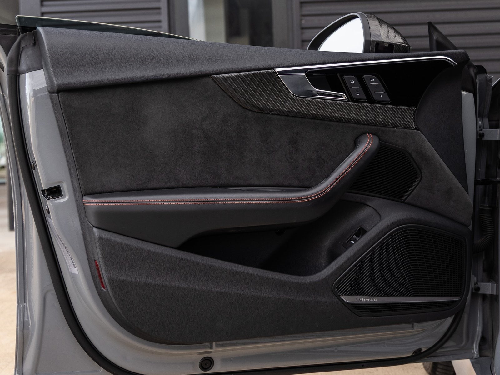 The RS 5 commands attention with its bold Nardo Grey exterior, a signature Audi Sport color that highlights its muscular stance and aerodynamic design. Carbon Fiber accents elevate its presence, including a Carbon Fiber Front Bumper Lip, Carbon Fiber Rear Bumper Lip, Carbon Fiber Rear Lip Spoiler, and Carbon Fiber Door Mirrors. Red Brake Calipers provide a vivid contrast behind the wheels, underscoring the RS 5s high-performance braking capability and motorsport-inspired character.