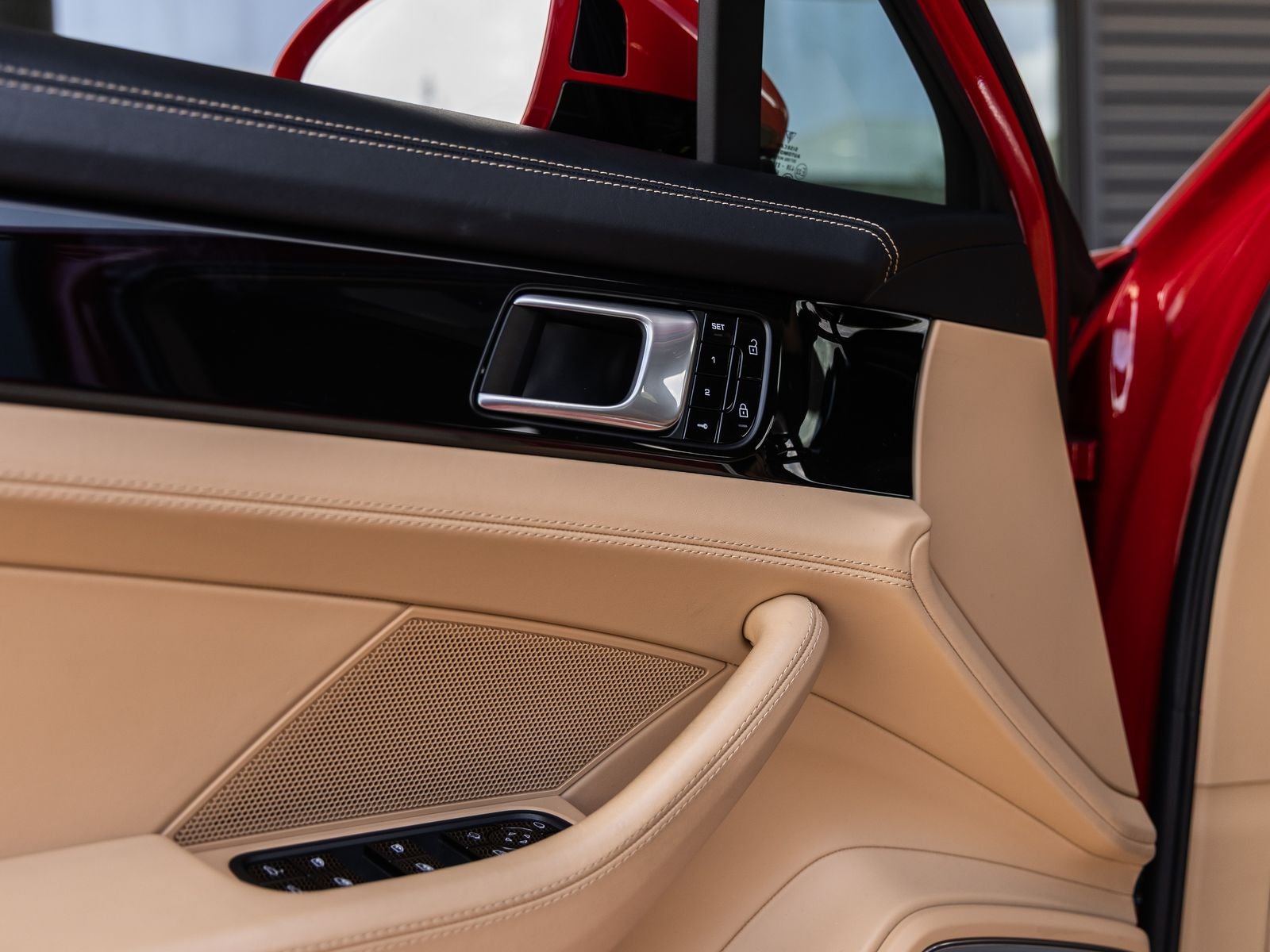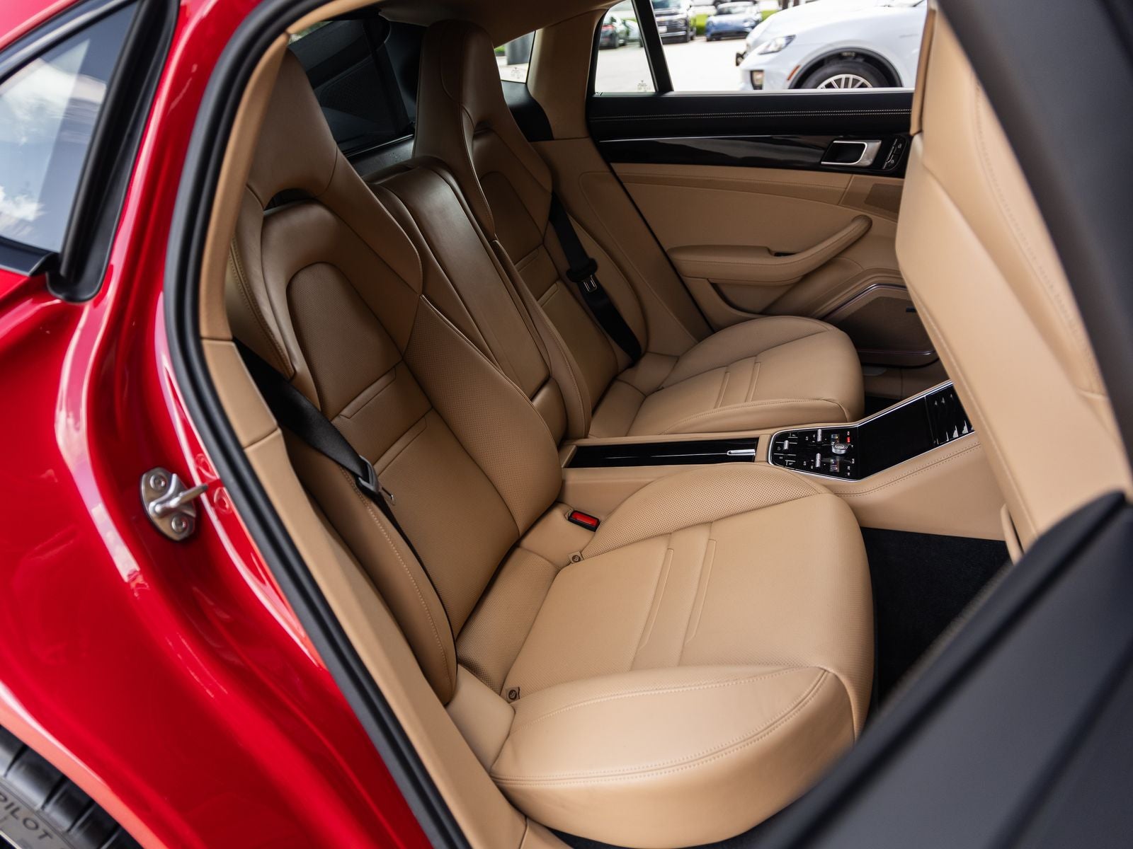 The Panamera stands as a beacon of design and performance, its Carmine Red exterior not just a color, but a bold expression of Porsches sporting heritage. Adorned with 21 Exclusive Design Wheels in High Gloss Black and LED Headlights including Porsche Dynamic Light System (PDLS), it presents a sleek and commanding presence. High Gloss Black accents including window trim and rear badging, along with SportDesign side skirts, enhance its dynamic and refined aesthetic.