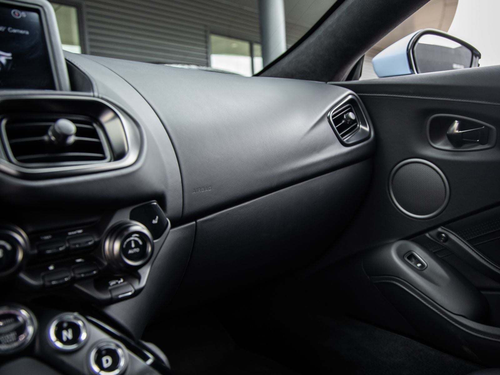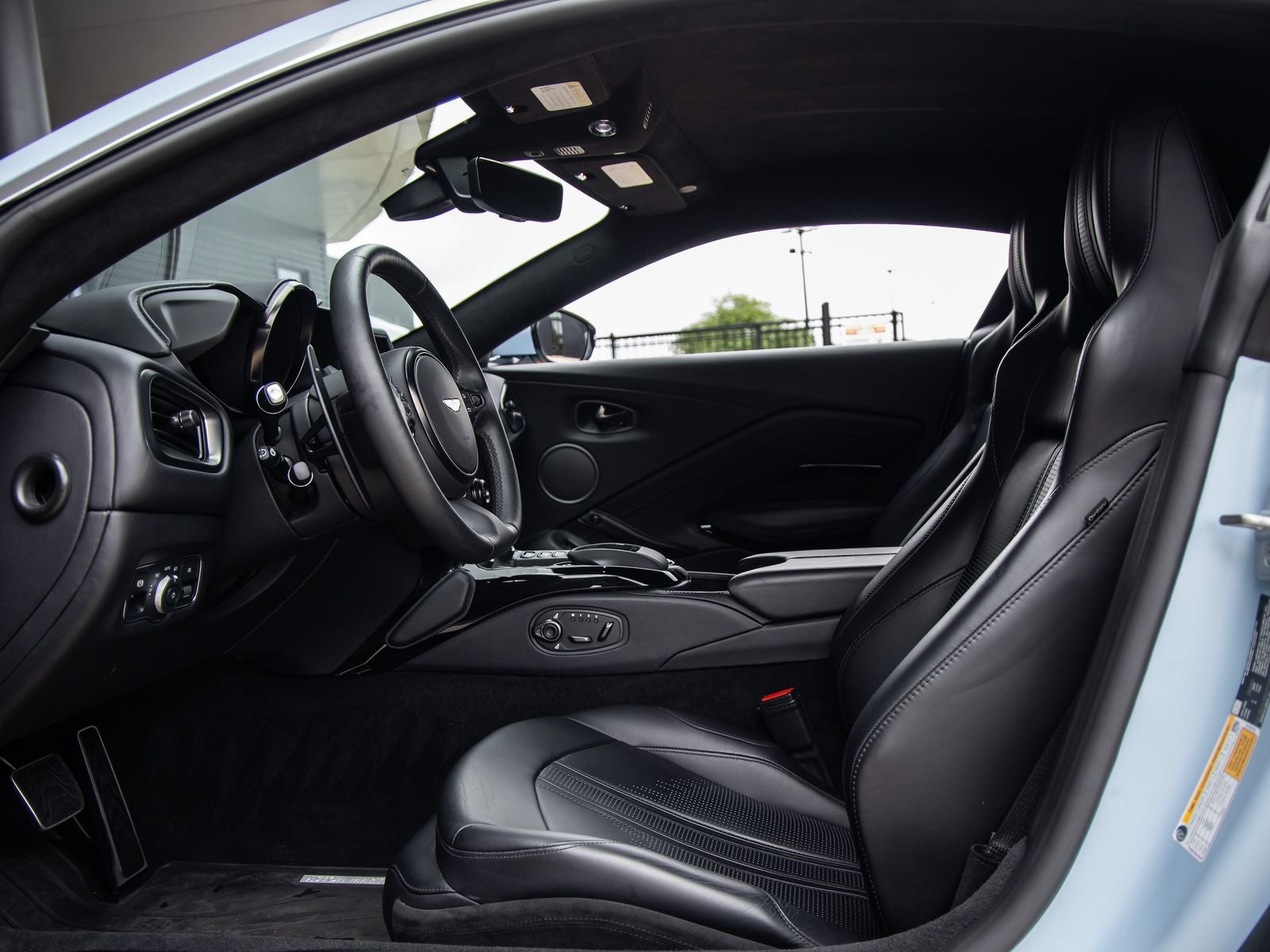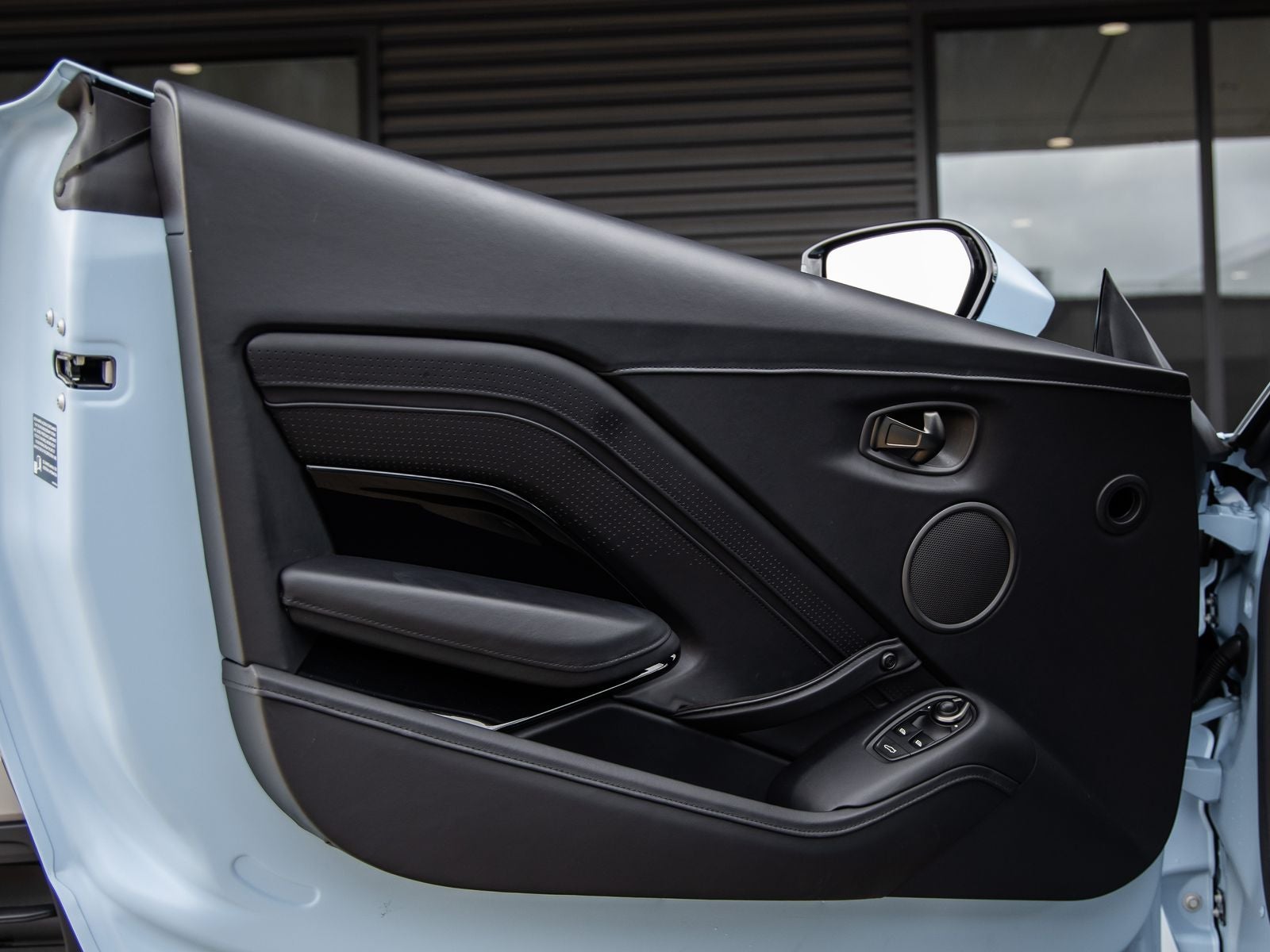 The Vantage stands as a beacon of design and performance, its Q Frosted Glass Blue exterior not just a color, but a badge of exclusivity that reflects Aston Martin's bespoke craftsmanship through its Q division. Sculpted with precision, its aggressive stance is complemented by signature LED headlights and striking alloy wheels, creating an unmistakable presence on the road. The aerodynamic body lines and iconic grille reinforce its identity as a true modern sports car.