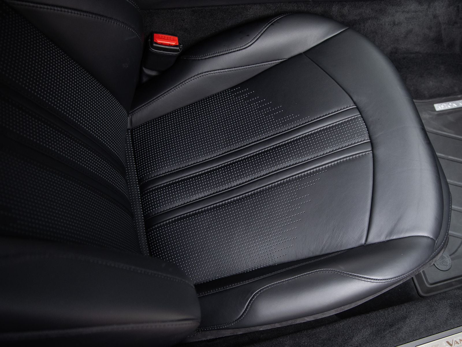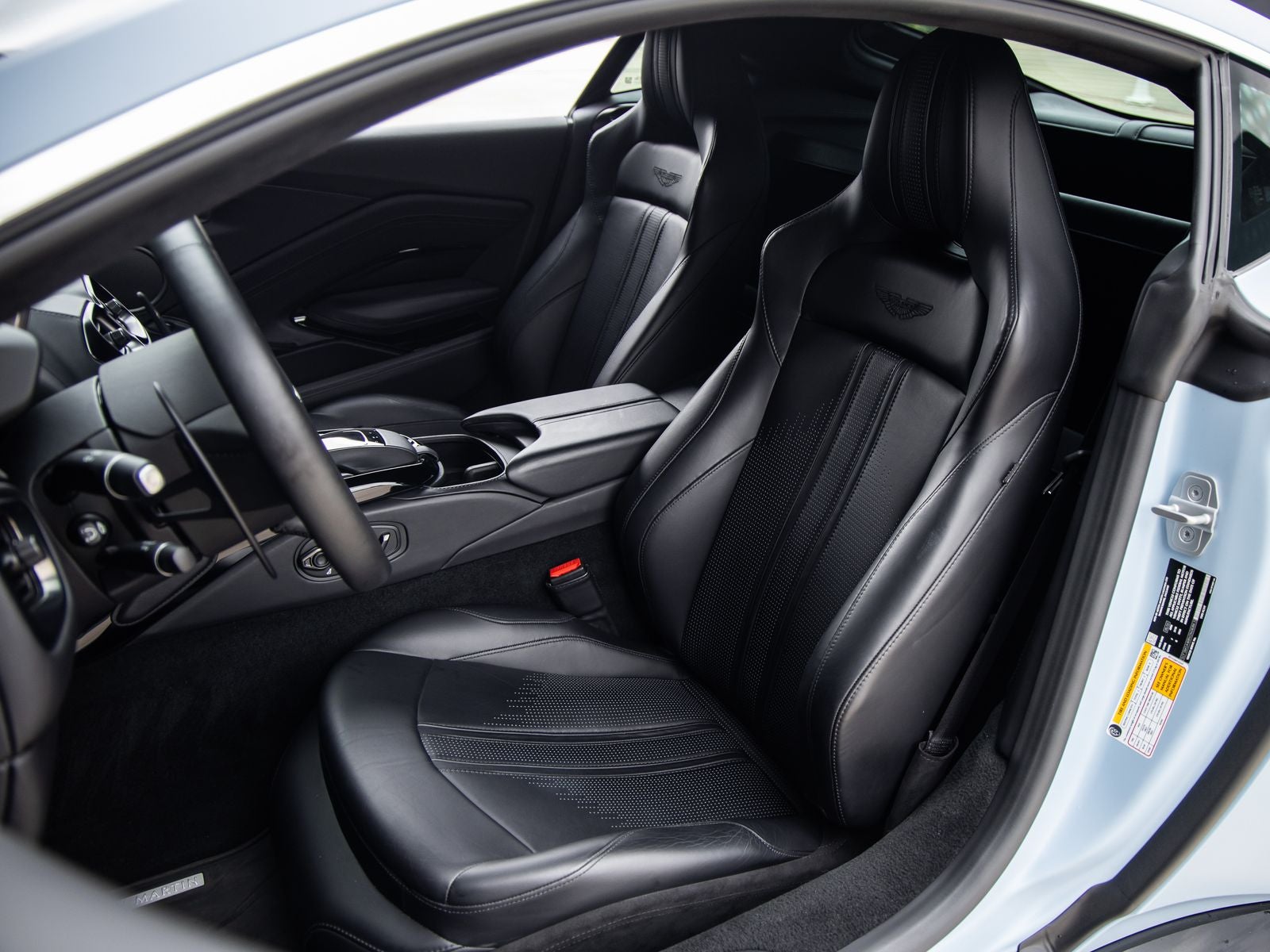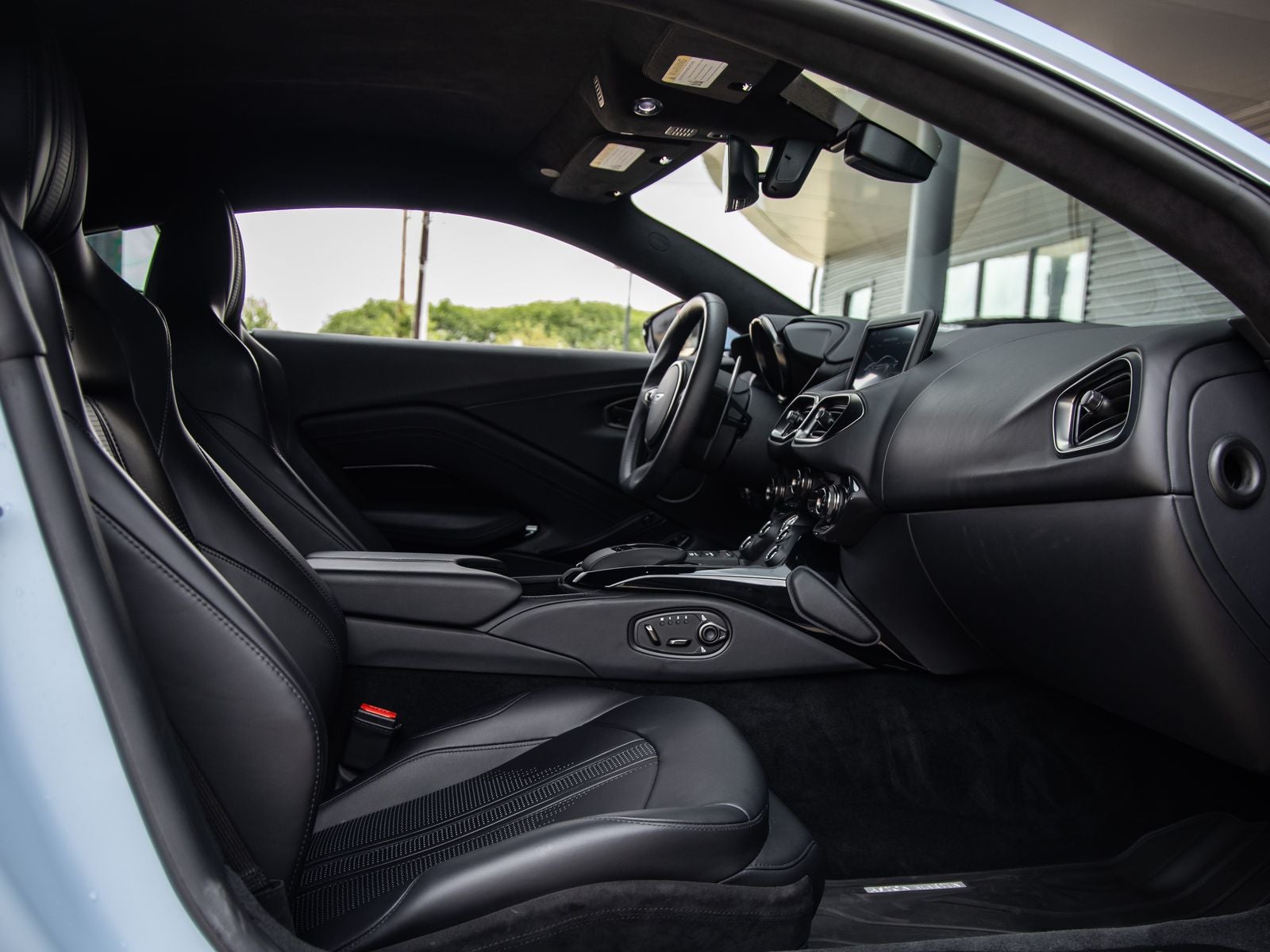 The Vantage stands as a beacon of design and performance, its Q Frosted Glass Blue exterior not just a color, but a badge of exclusivity that reflects Aston Martin's bespoke craftsmanship through its Q division. Sculpted with precision, its aggressive stance is complemented by signature LED headlights and striking alloy wheels, creating an unmistakable presence on the road. The aerodynamic body lines and iconic grille reinforce its identity as a true modern sports car.