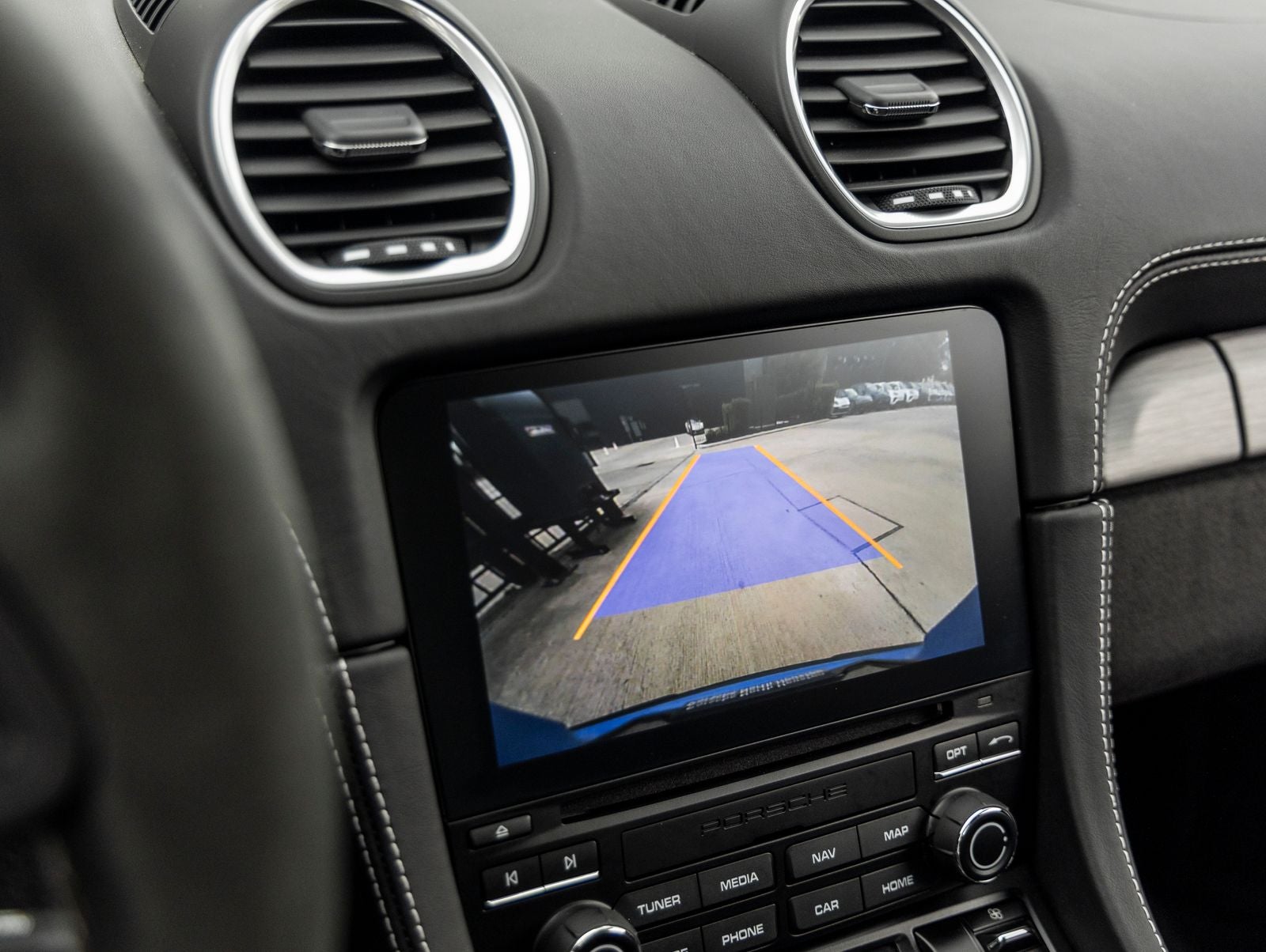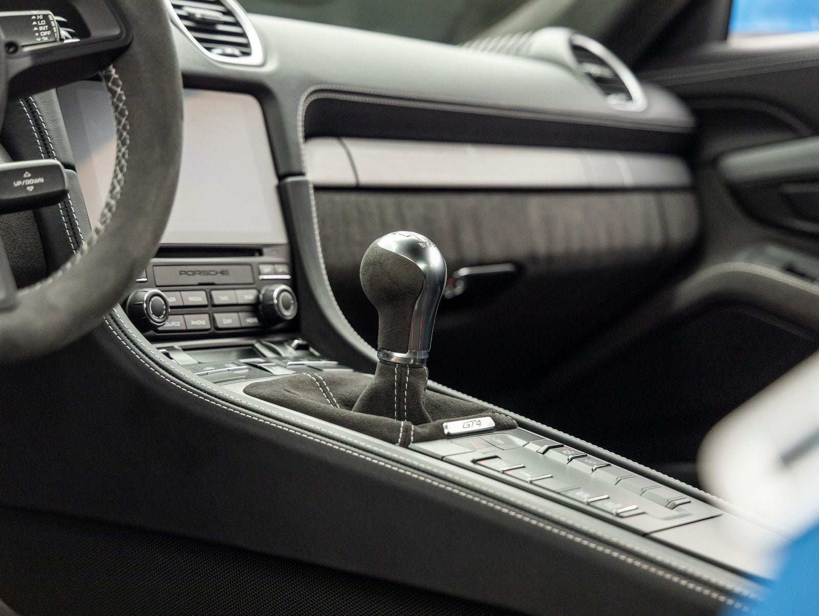 The 718 Cayman GT4 stands as a beacon of design and performance, its Shark Blue exterior not just a color, but a badge of honor that reflects Porsche's illustrious racing heritage. Adorned with Satin Black Wheels and Bi-Xenon Headlights in Black with Porsche Dynamic Light System (PDLS), it presents an aggressive and track-focused stance. The Satin Black PORSCHE Logo and Porsche Ceramic Composite Brakes (PCCB) further enhance its commanding presence and performance pedigree.