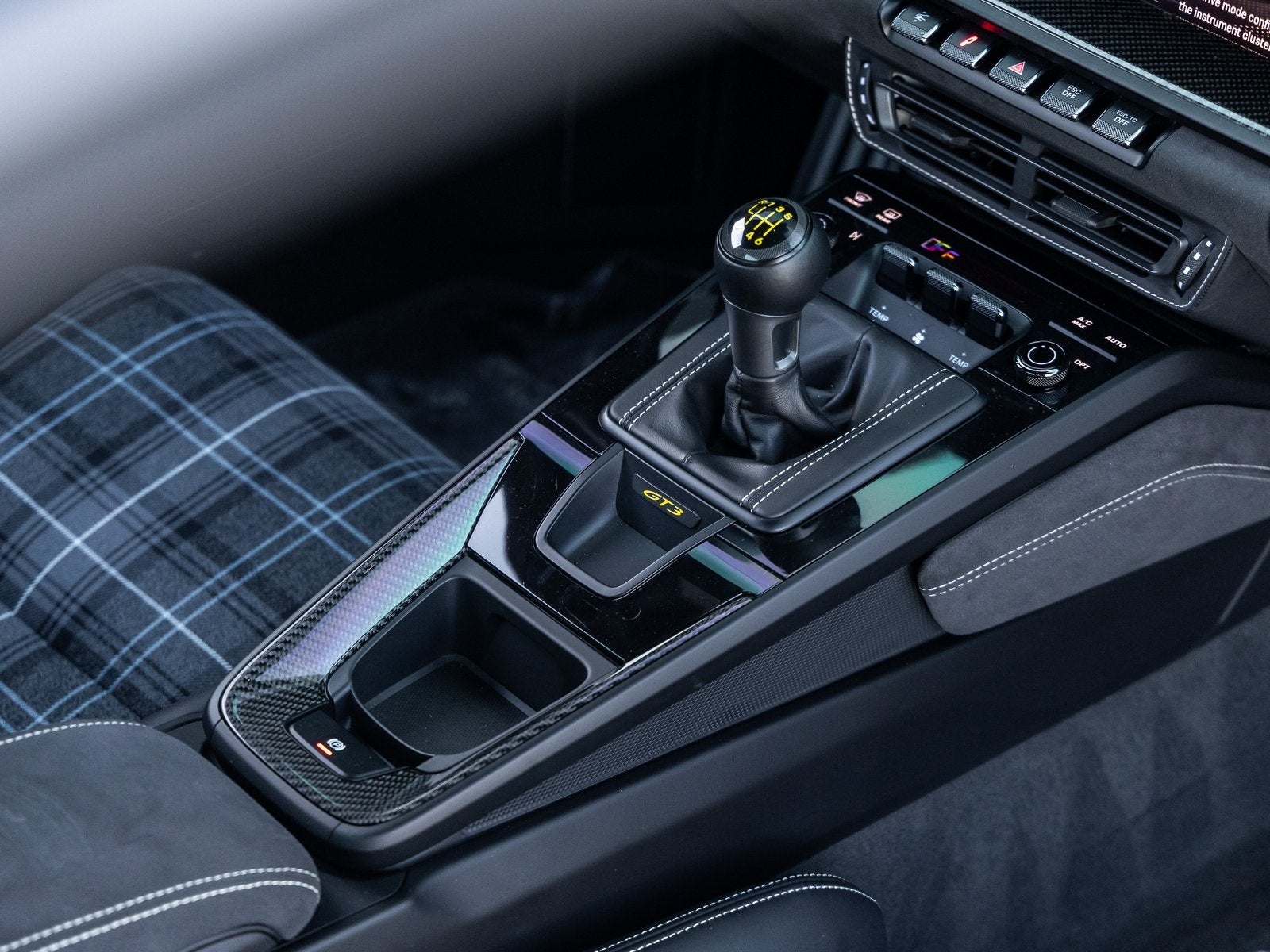 Step inside and the Leather/Race-Tex Interior in Black with GT Silver Stitching greets you, exuding an air of luxury that only Porsche can deliver. Full Bucket Seats, Chrono Package with Preparation for Lap Trigger, and extensive leather detailing such as the Extended Dashboard and Door Panel Package and Air Vent Surrounds in Chalk Leather elevate the cabin's racing pedigree with refined craftsmanship. Touches like the Center Console Lid in Race-Tex with Porsche Crest, Bespoke Floor Mats with Leather Edging, and Interior Trim Inlays and Door-Sill Guards in High Gloss Carbon Fiber complete the bespoke ambiance.