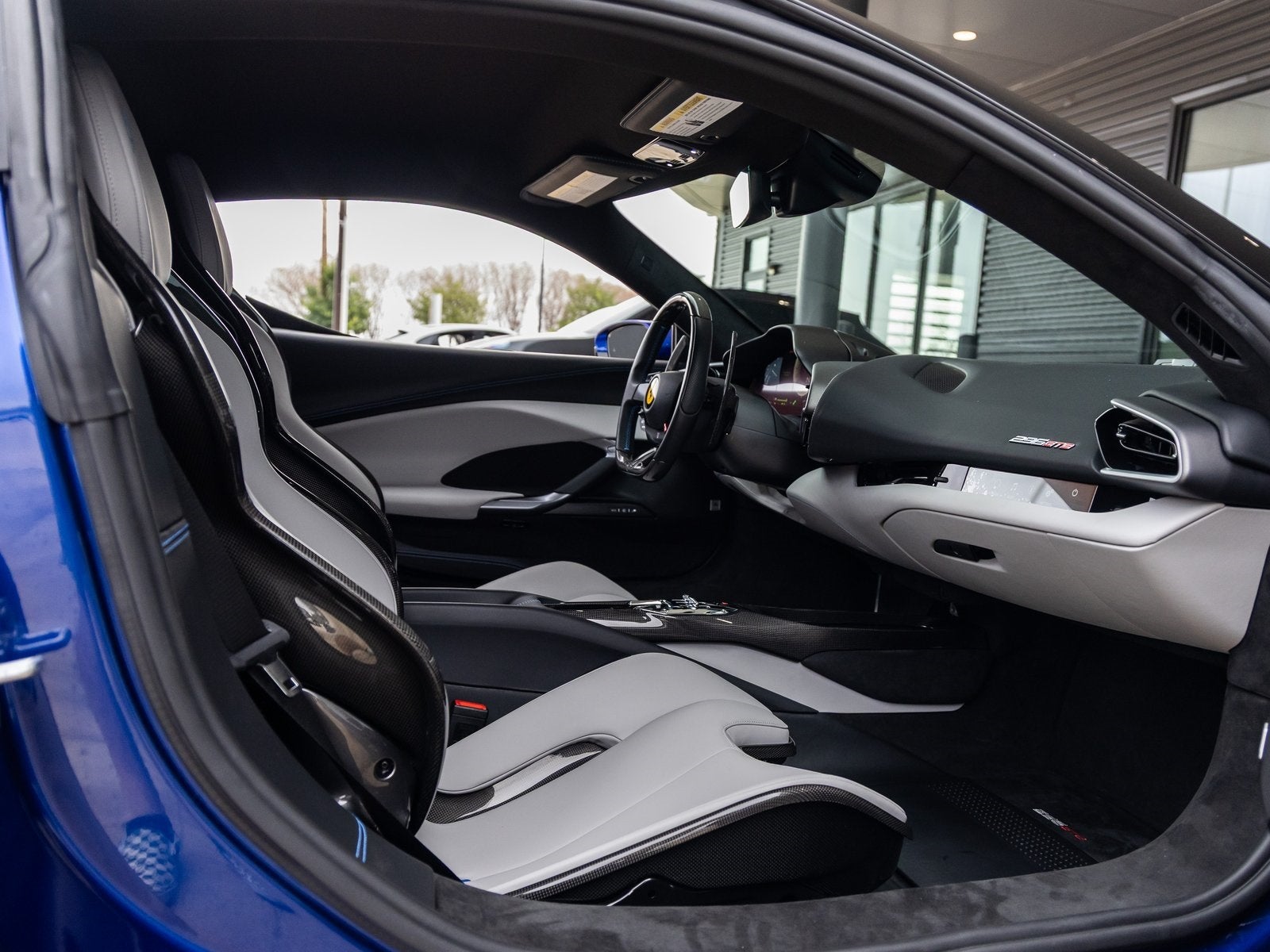 Step inside and the Grigio Corvara interior surrounds you in a tailored blend of technology and comfort. This 296 GTB is outfitted with Carbon Fiber Racing Seats (XL), finished in Extrarange leather with Azzurro Santorini 59120 detailing, and stitched Cavallino emblems in Azzurro S. 1318. The upper center console is finished in carbon fiber, complemented by colored special stitching and colored passenger compartment details in matching Extrarange hues. A Premium Hi-Fi System and Apple CarPlay provide modern convenience and entertainment, while the Advanced Front Driving Camera and Surround View systems enhance situational awareness.