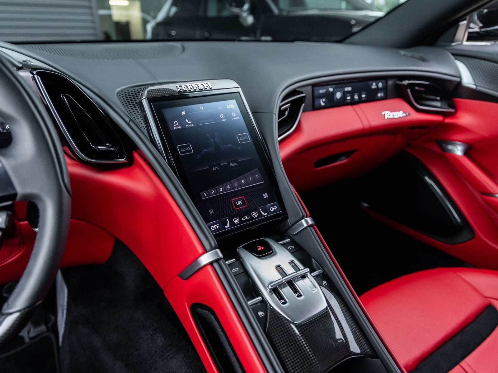 Inside, the cabin is trimmed in Rosso Giudecca Extracampionario Leather with Top Contrast Stitching in Antracite, delivering a bold yet refined atmosphere. Highlights include Full Electric Seats, Passenger Display, Smartphone Interface, and Wireless Charging. Carbon fiber trim extends to the dashboard inserts and center console, underscoring the Roma Spiders bespoke design.