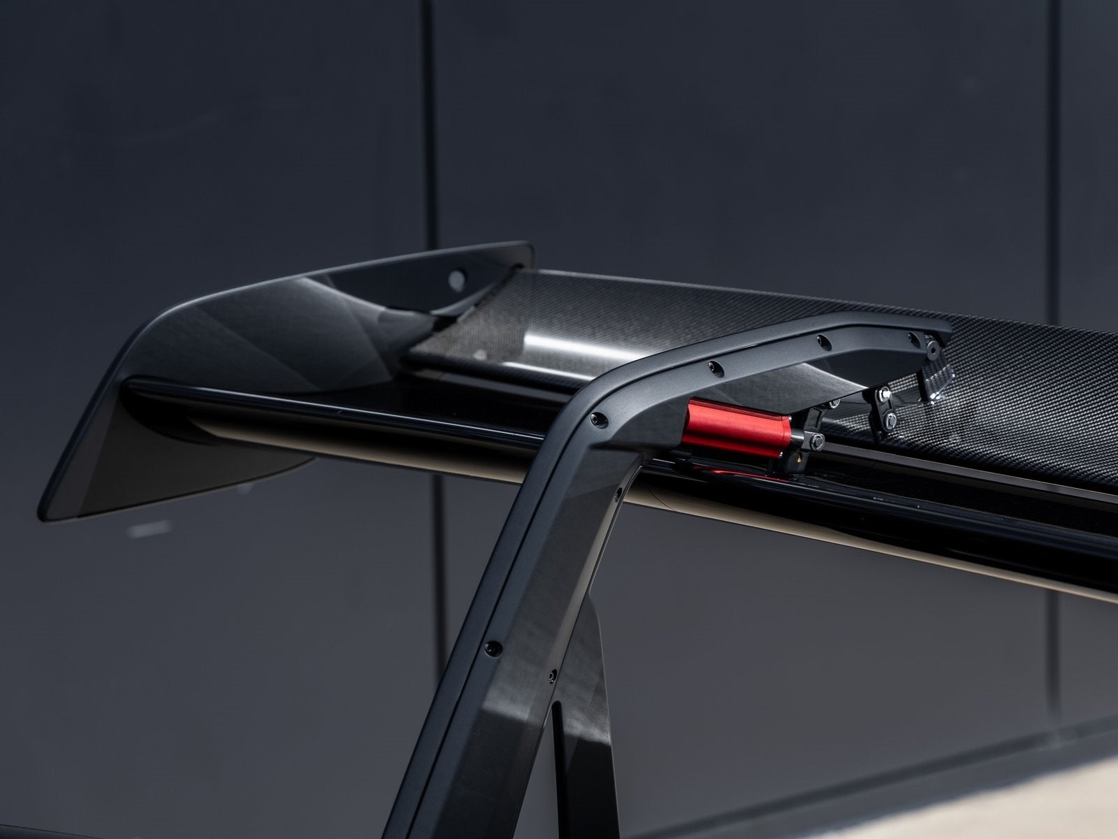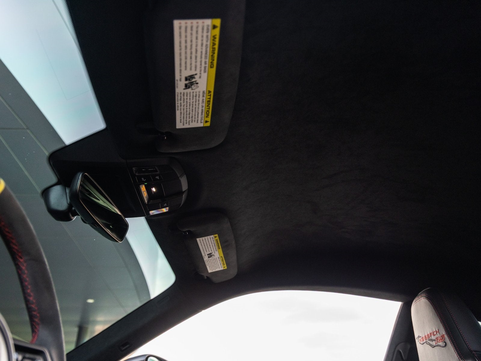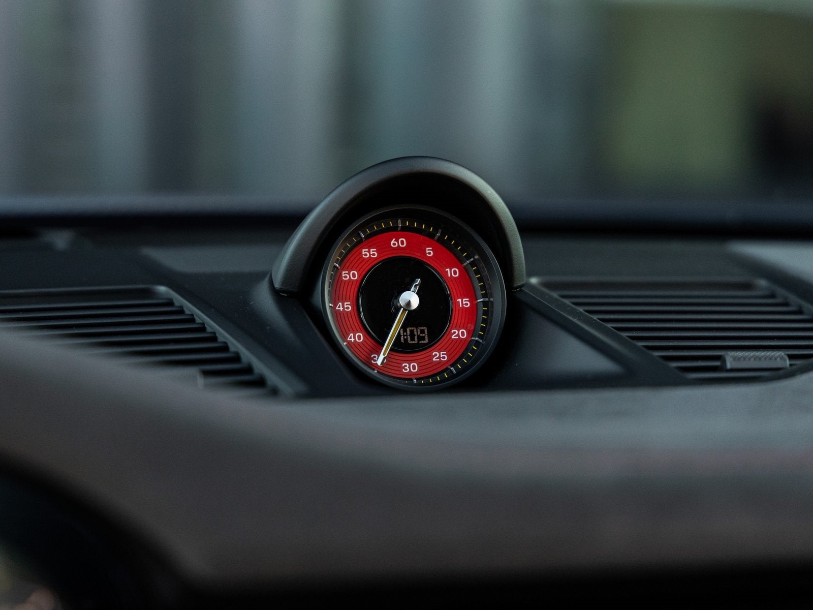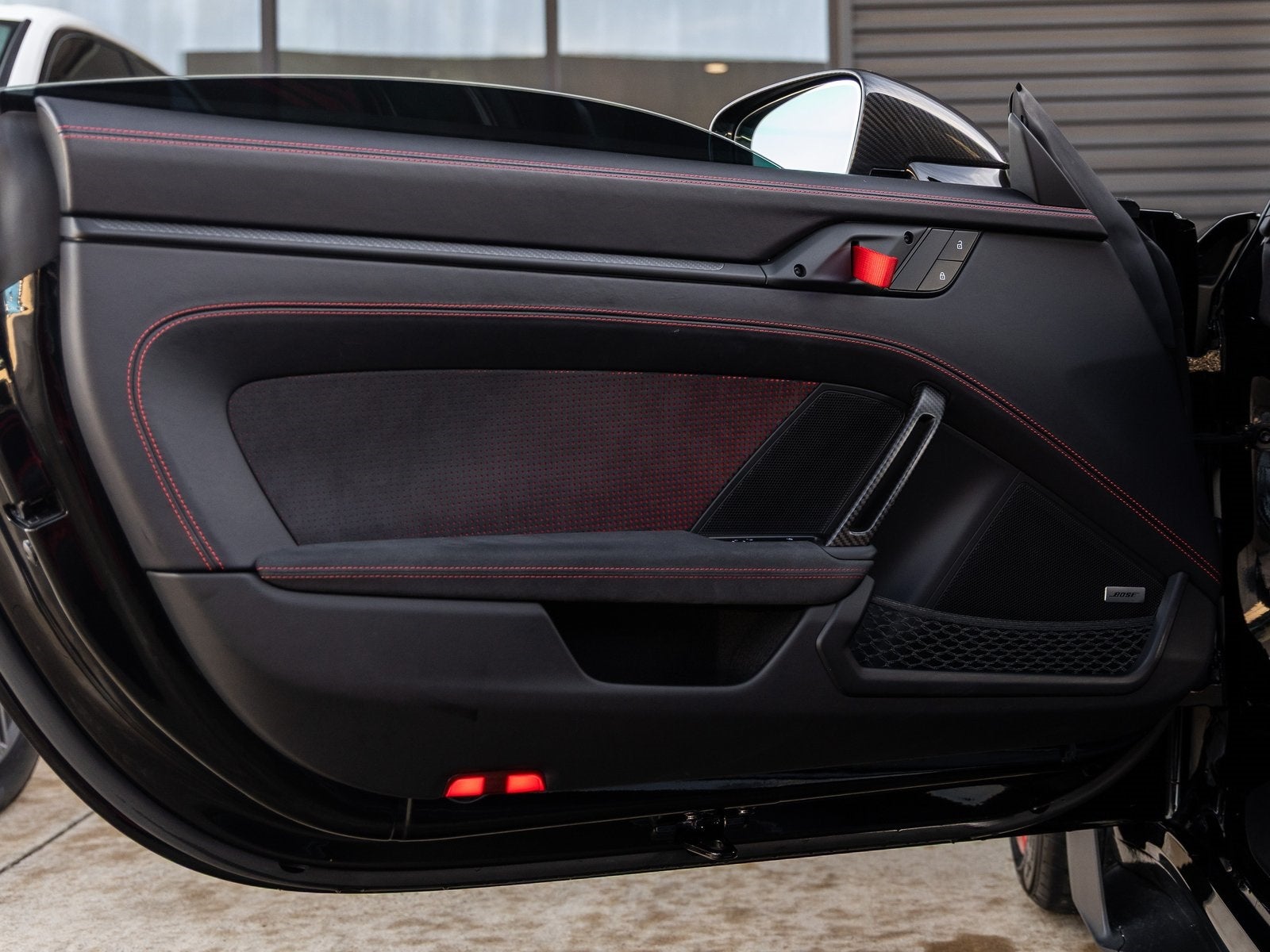 Step inside and you are immersed in a Leather/Race-Tex interior in Black with Guards Red stitching, crafted to keep the driver fully connected to the road or track. Adaptive Sport Seats Plus (18-way) provide exceptional support, while Guards Red accents such as the central tachometer, seat belts, and Chrono stopwatch dial reinforce the motorsport-inspired cockpit. Bespoke illuminated door-sill guards in matte carbon fiber, a Race-Tex center console lid with Porsche Crest, and aluminum pedals and footrest elevate the interior with a purposeful yet luxurious finish.