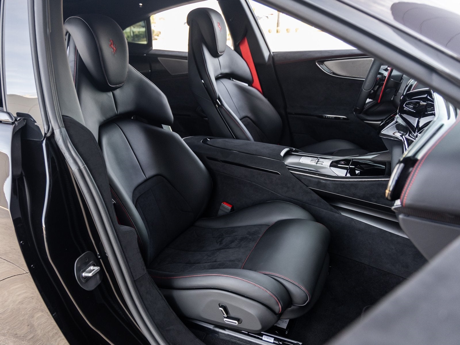 Step inside and you're surrounded by an opulent Nero Alcantara cabin with a full suite of Ferrari craftsmanship. Details like Rosso Corsa Dreamline on F1 Paddles and Rosso 0504 Cavallino Stitched Headrests provide vivid accents against the dark interior. Features such as the Front Seats with Massage and Ventilation, Digital Rearview Mirror, High-End Audio System, and Wireless Smartphone Charger make every journey a first-class experience. Additional touches include Colored Safety Belts in Red, Custom Interior Specifications, and Upper Part of Center Console in Carbon Fiber.