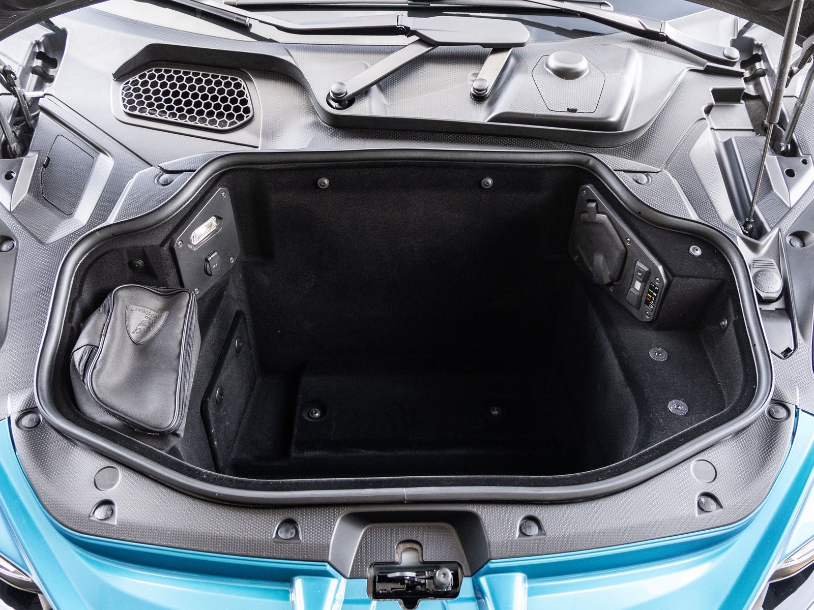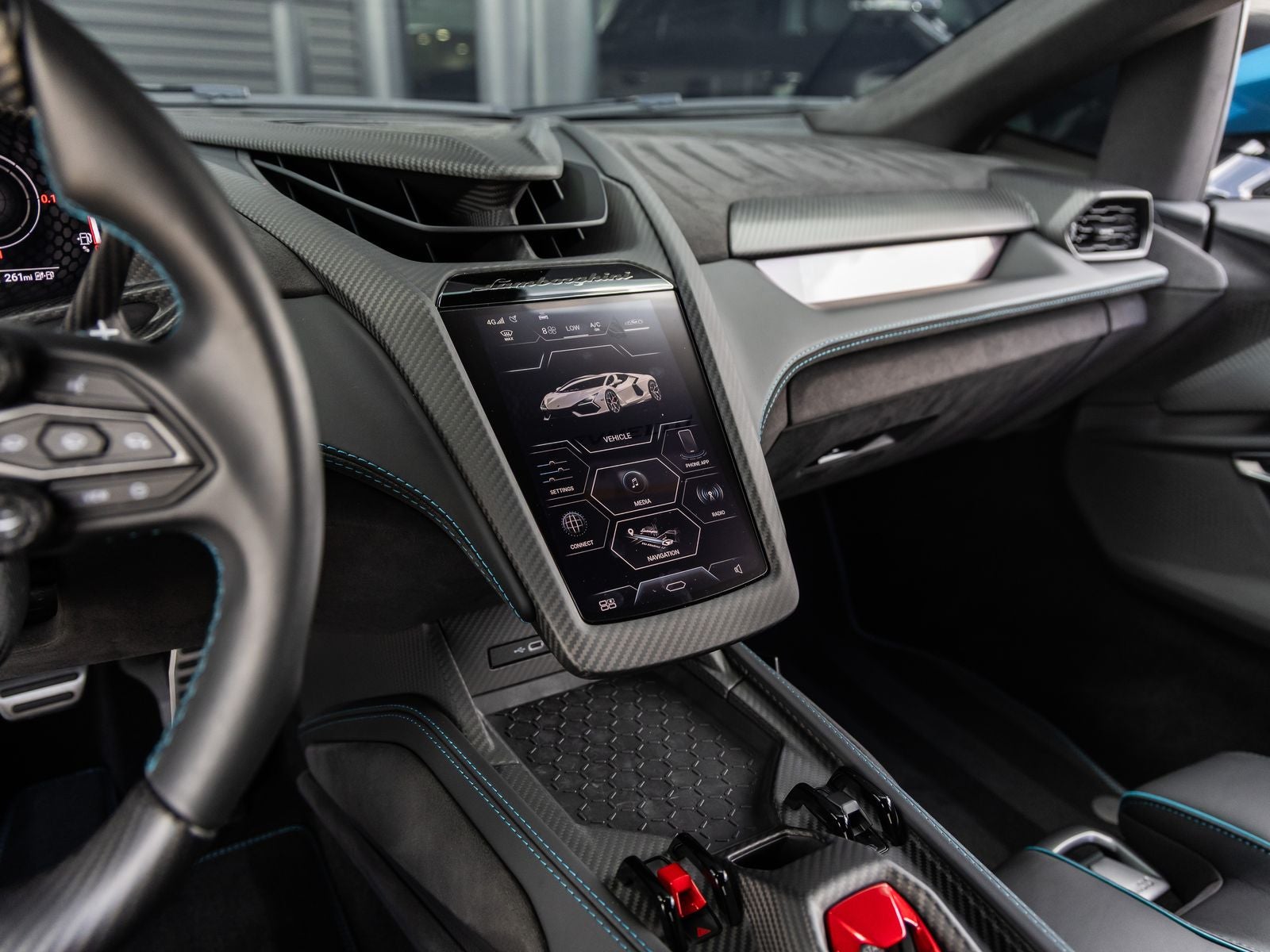 The Revuelto stands as Lamborghinis revolutionary flagship, its Blu Uranus exterior radiating sophistication and aggression in equal measure. Sculpted with sharp aerodynamic lines and enhanced by the Extended Shiny Carbon Pack, this supercar commands attention from every angle. Sitting on Altanero Shiny Black 21/22 wheels and complemented by Nero Lucido carbon ceramic brake calipers, its presence is both futuristic and unmistakably Lamborghini.