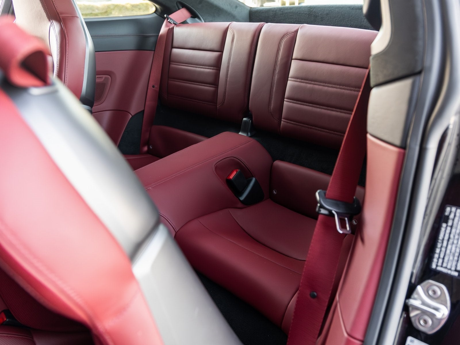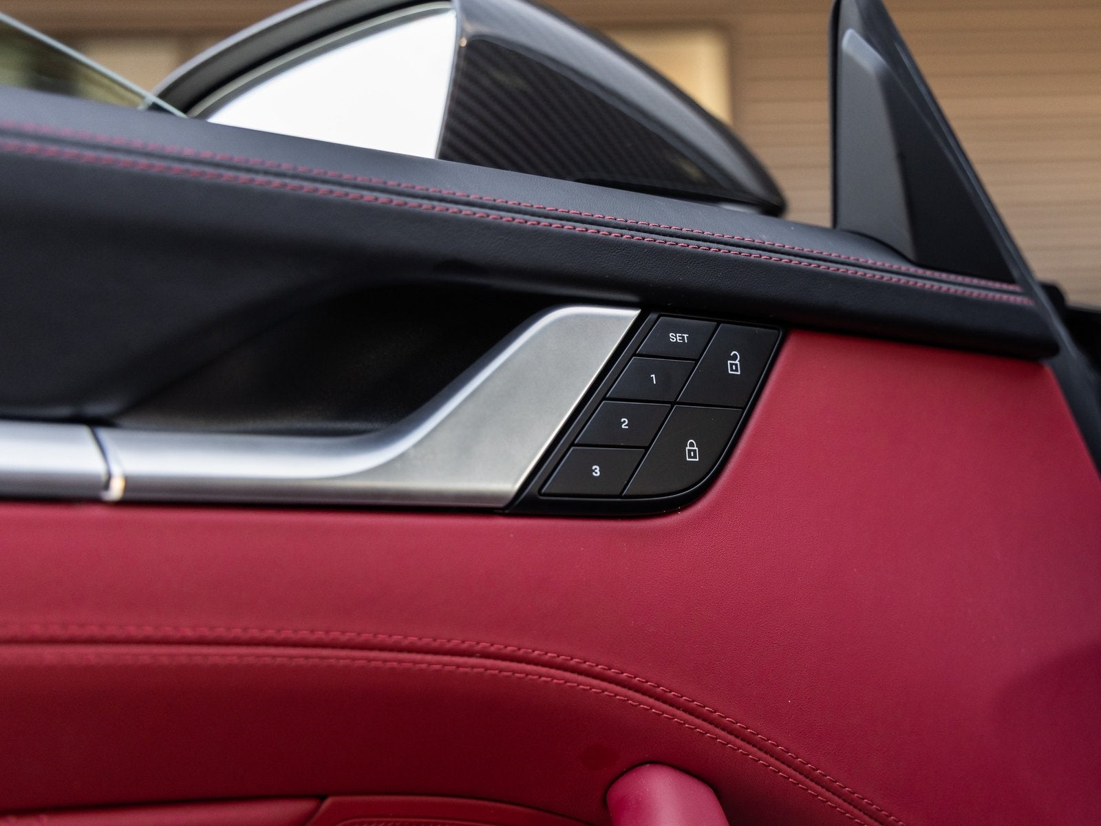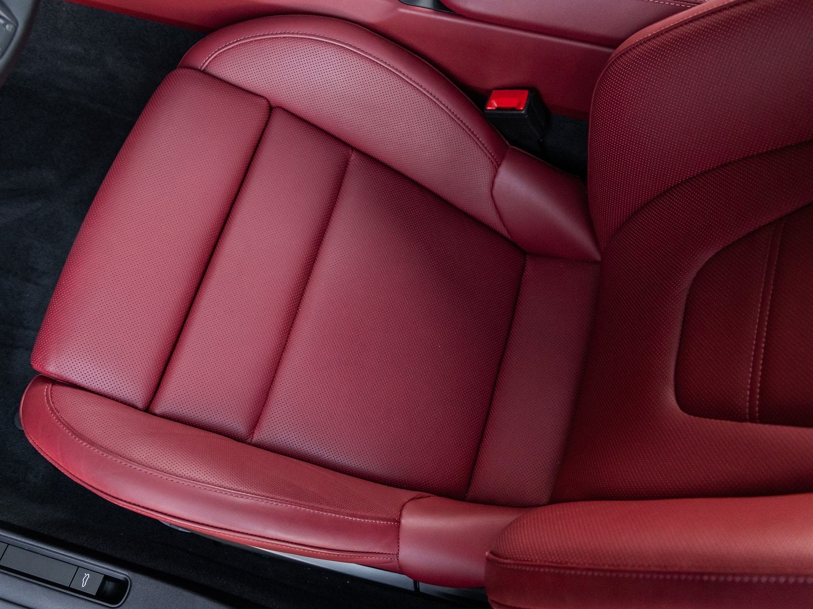 Inside, the Black/Bordeaux Red Leather Interior offers luxury with sporty details. The cabin features a Heated GT Sport Steering Wheel, Seat Belts in Bordeaux Red, Sun Visors in Leather, and Illuminated Brushed Aluminum Door-Sill Guards. A Burmester High-End Surround Sound System, Ambient Lighting, and Porsche Design Subsecond Clock complete the experience.