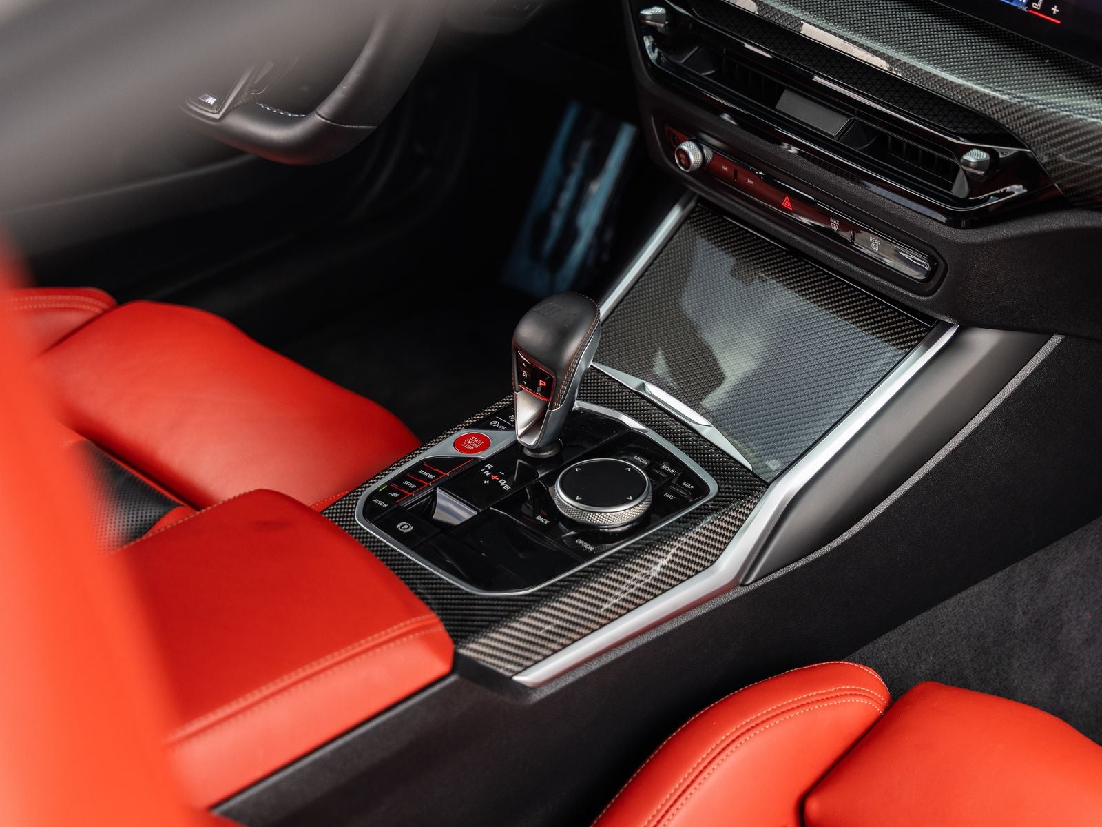 The M4 Competition Coupe stands as a bold expression of aggressive styling and track-ready capability, its Alpine White exterior accentuating its sculpted lines and aerodynamic presence. Adorned with 19/20-inch M Dual-Spoke Bi-Color Wheels and a striking M Carbon Roof, it delivers both lightweight performance and unmistakable design. Shadowline Exterior Trim and Full LED Headlights with Laserlight Taillights further enhance its commanding and modern aesthetic.