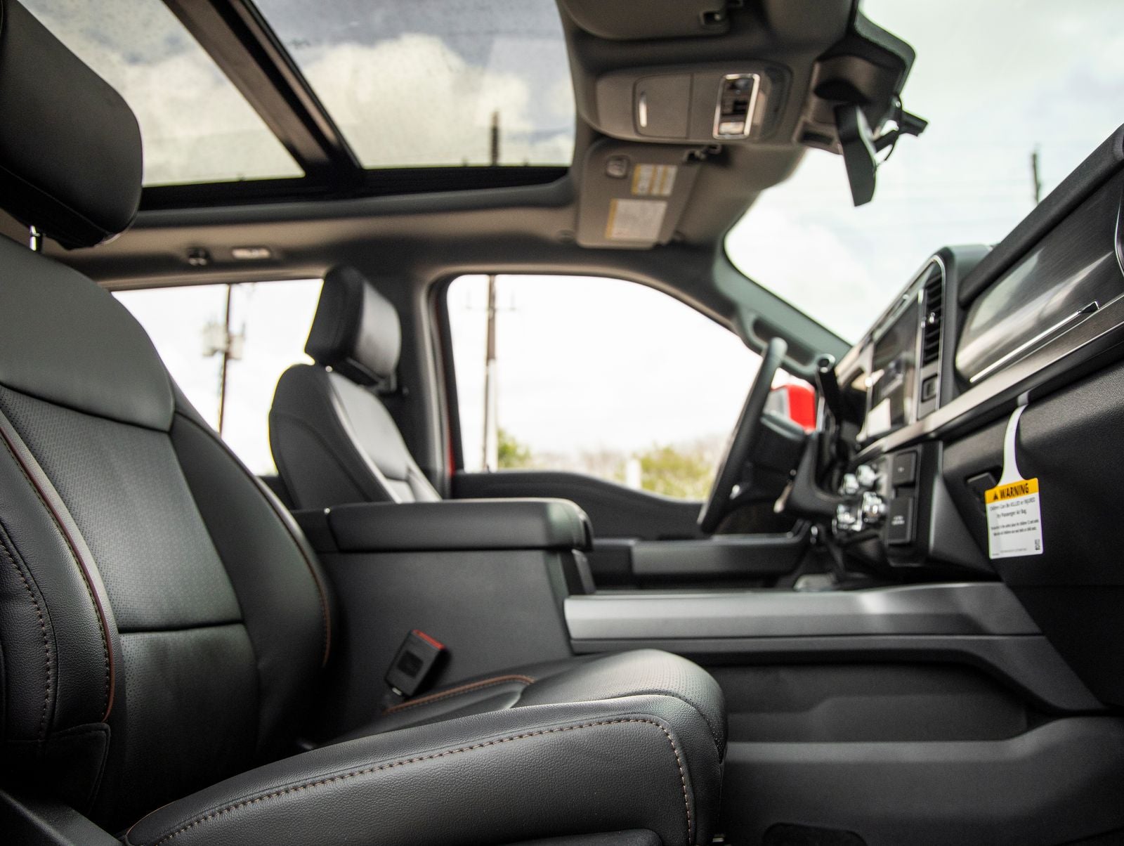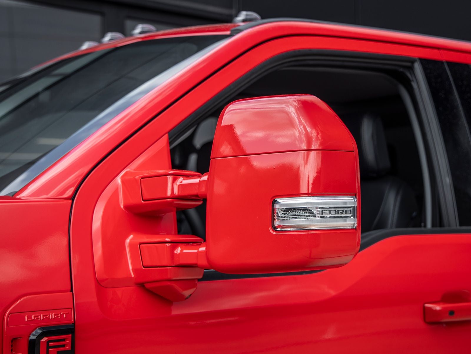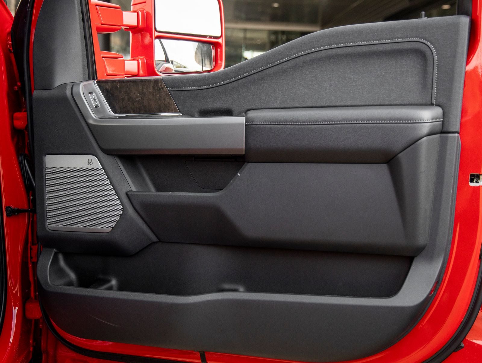 The F-450 Lariat stands as a commanding presence of design and performance, its Race Red exterior not just a color, but a bold statement of strength and purpose. Adorned with LED Reflector Headlamps, rain-sensing wipers, and PowerScope power-fold heated towing mirrors, it presents an imposing and functional stance ready for any task. The Power Tailgate Lock, integrated trailer brake controller, and trailer sway control further reinforce the trucks reputation as a dependable workhorse built for serious towing and hauling.