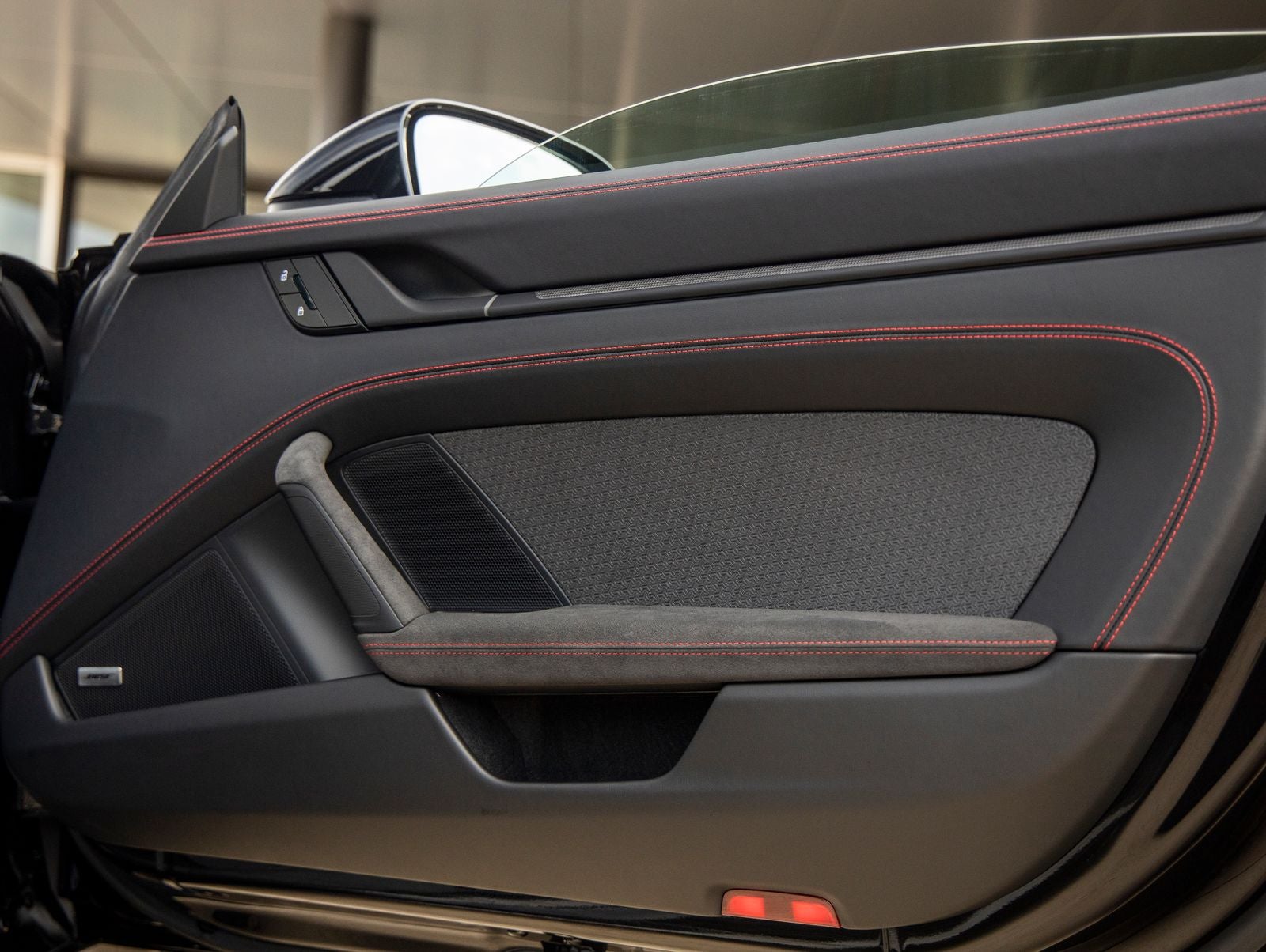 Step inside and the GTS Interior Package in Carmine Red greets you, exuding an air of race-inspired luxury that only Porsche can deliver. The Adaptive Sport Seats Plus (18-way) with Memory Package provide exceptional comfort and support, while the Heated GT Sport Steering Wheel in Leather with Matte Carbon Fiber trim adds a tactile, performance-focused touch. Accents such as the Carmine Red Digital Tachometer and premium materials throughout the cabin elevate the driving experience to an entirely new level.